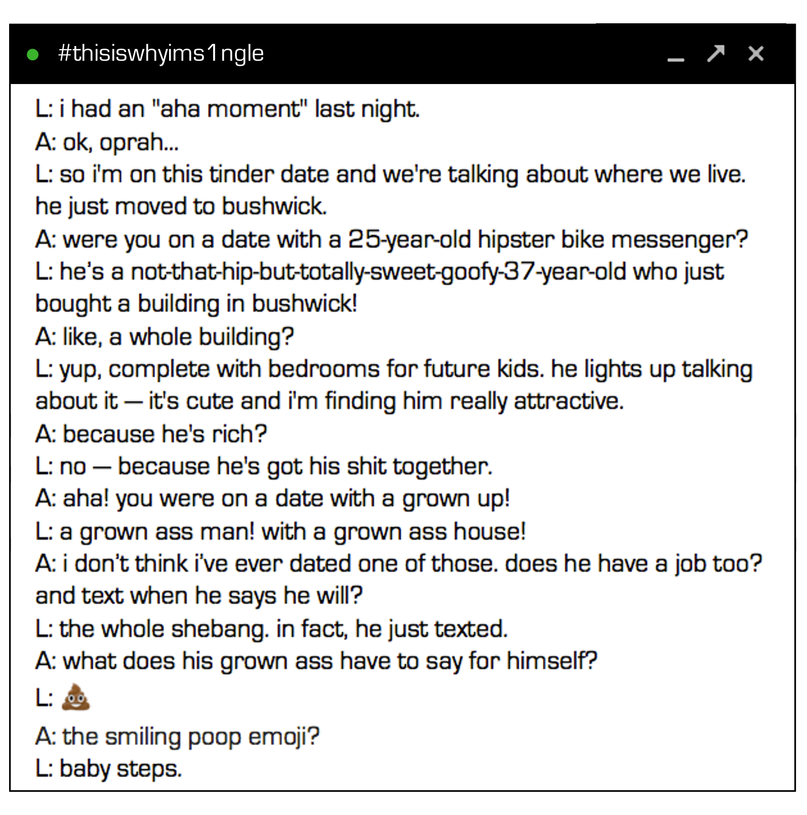 Tagged #chat, #date, #dating, #ex, #IM, #single, #tagline, #thisiswhyims1ngle, #thisiswhyimsingle, flirt