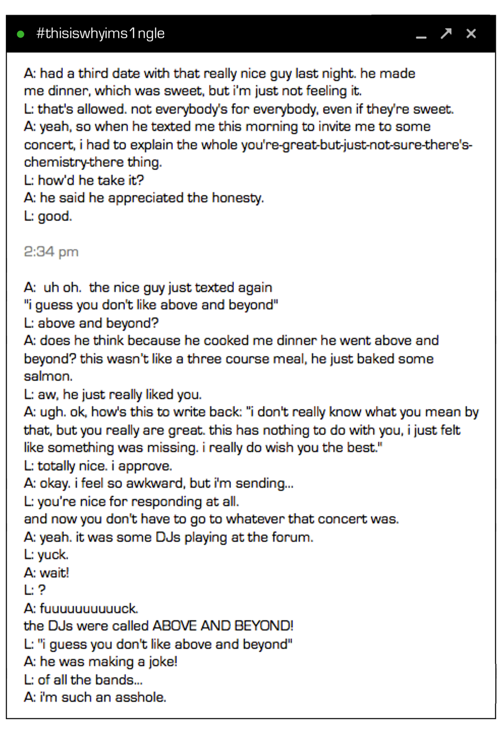 Tagged #aboveandbeyond, #chat, #date, #dating, #dj, #gchat, #onlinedating, #single, #text, #thisiswhyims1ngle, #thisiswhyimsingle